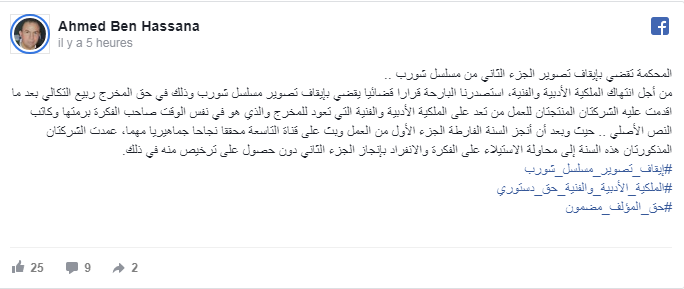 ونشر بن حسانة، تدوينة على حسابه الخاص على موقع التواصل الاجتماعي "فايسبوك" أفاد من خلالها بأن المحكمة تقضي بإيقاف تصوير الجزء الثاني من مسلسل "شورب" من أجل انتهاك الملكية الأدبية والفنية.