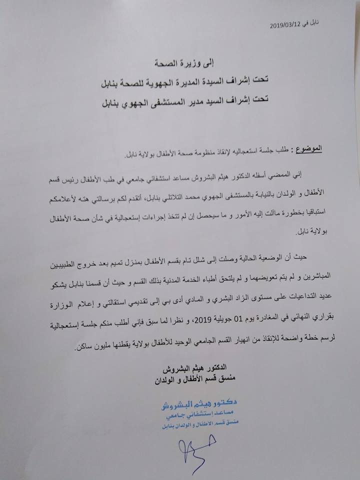 يذكر أن منسق قسم الولدان بالمستشفى الجامعي محمد التلاتلي بنابل الدكتور هيثم البشروش كان توجه برسالة عاجلة جاء فيها أن قسم الأطفال بمستشفى منزل تميم يعاني شللا تاما و ذلك بعد مغادرة الطبيبن المباشرين وعدم تعويضهما، حيث أن مستشفى منزل تميم لا يتضمّن ولو طبيب أطفال واحد، وفق ما جاء في نص الرسالة التي توجّه بها.