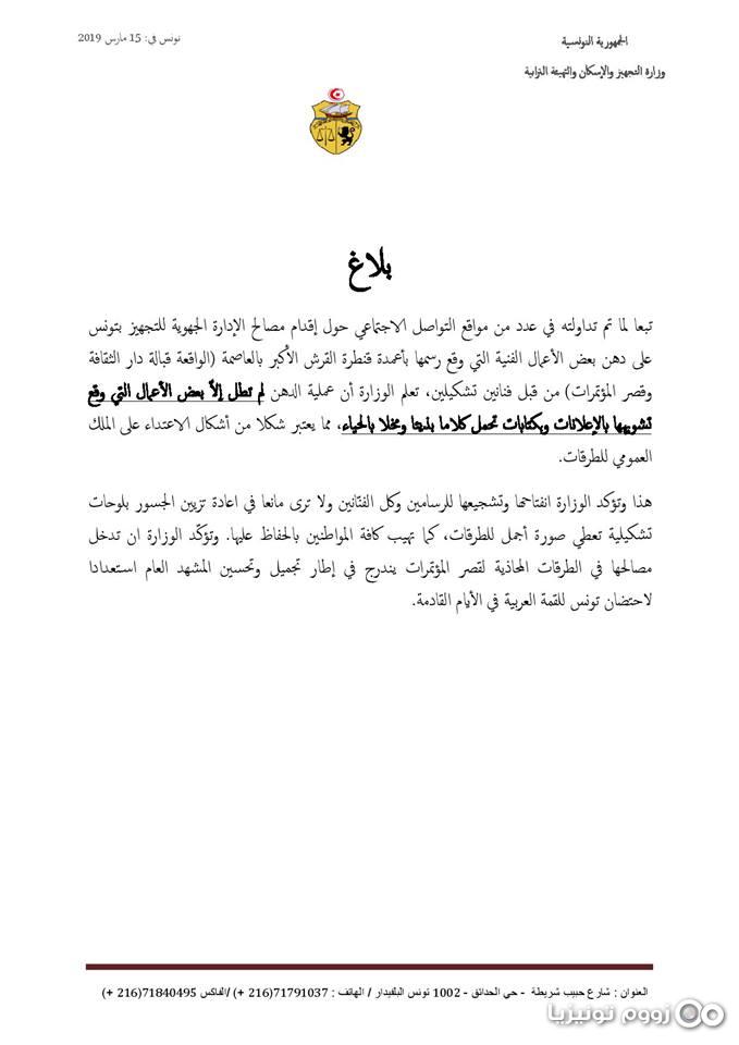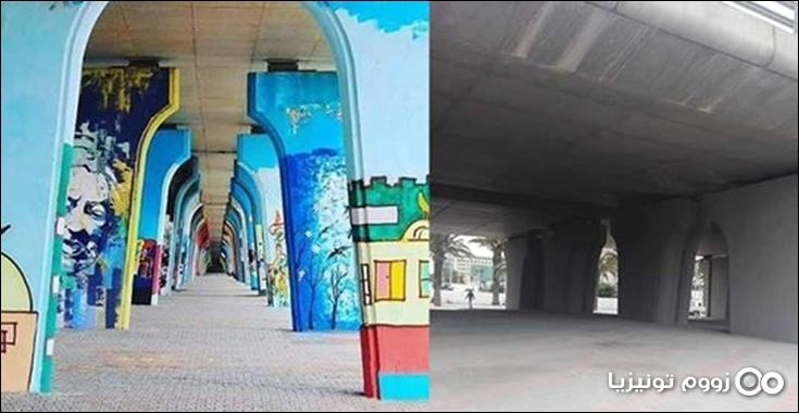 وأكّد مراد الحمروني المدير الجهوي للتجهيز، اليوم الجمعة 15 مارس 2019، أنّ عمليّة الدهن لم تطل كافة الأعمال الفنية بل طالت فقط الأعمال التى وقع تشويهها بالإعلانات التي تلصق عشوائيا أو بكتابات تحمل كلاما بذيئًا.
