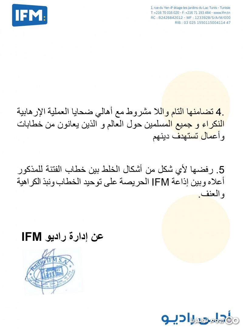 زووم- توجّهت إدارة إذاعة IFM، ببيان للرأي العام، لتوضيح بعض النقاط المتعلقة بالتدوينة المشينة التي نشرها المدعو غيث السويسي على موقع التواصل الاجتماعي Facebook حول الاعتداء الإرهابي الذي استهدف مسجدين في نيوزيلندا.
