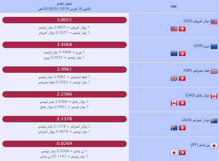 وفي ما يلي تفاصيل أسعار العملة بالدينار التونسي لليوم، الاثنين 18 مارس 2019: