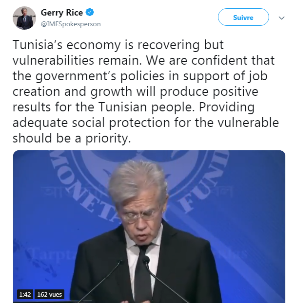 كتب الناطق الرسمي باسم صندوق النقد الدولي "جيري رايس" في تغريدة على حسابه الرسمي على "تويتر" أن "الاقتصاد التونسي يتعافى لكن نقاط الضعف لا تزال قائمة".