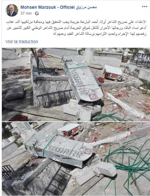 قال أمين عام حركة مشروع تونس محسن مرزوق أن مجهولين أقدموا ليلة البارحة على تهشيم ضريح الشاعر الصغير أولاد أحمد.