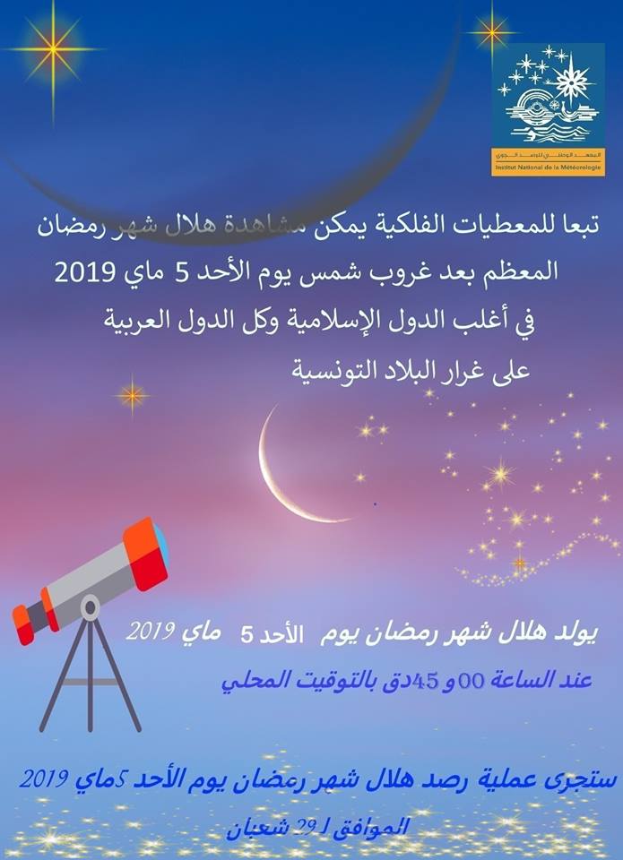 أفاد المعهد الوطني للرصد الجوي أن عملية رصد هلال شهر رمضان ستُجرى يوم الأحد، 05 ماي 2019.