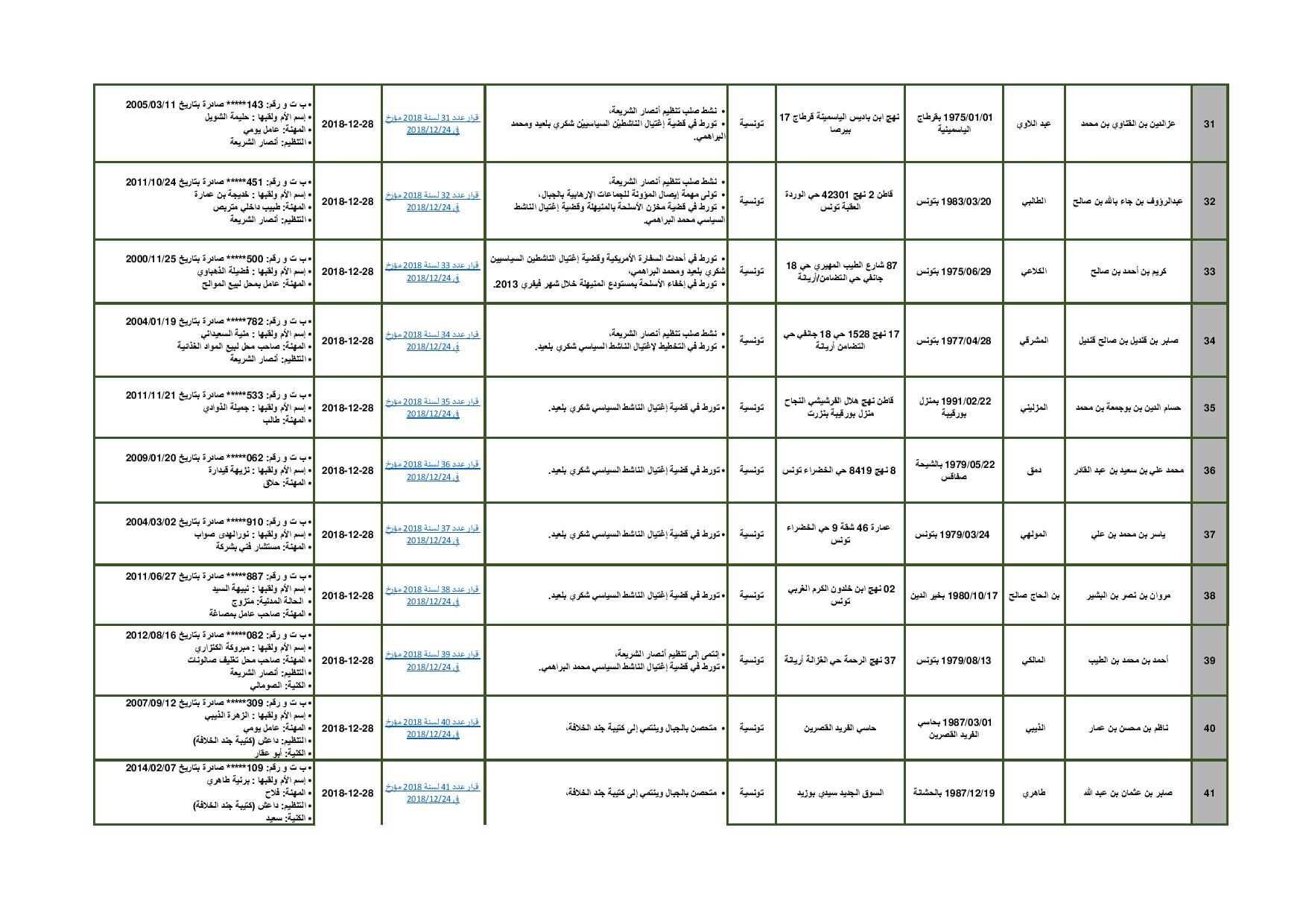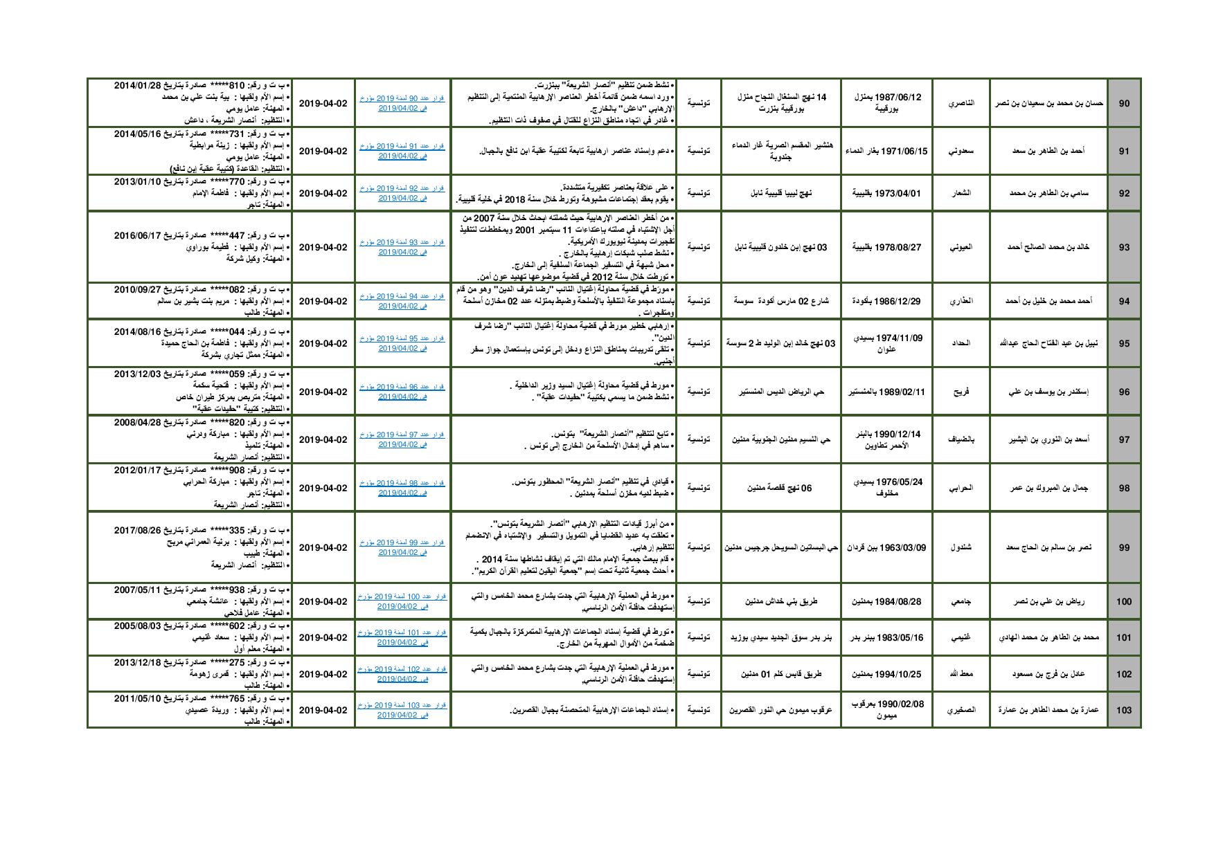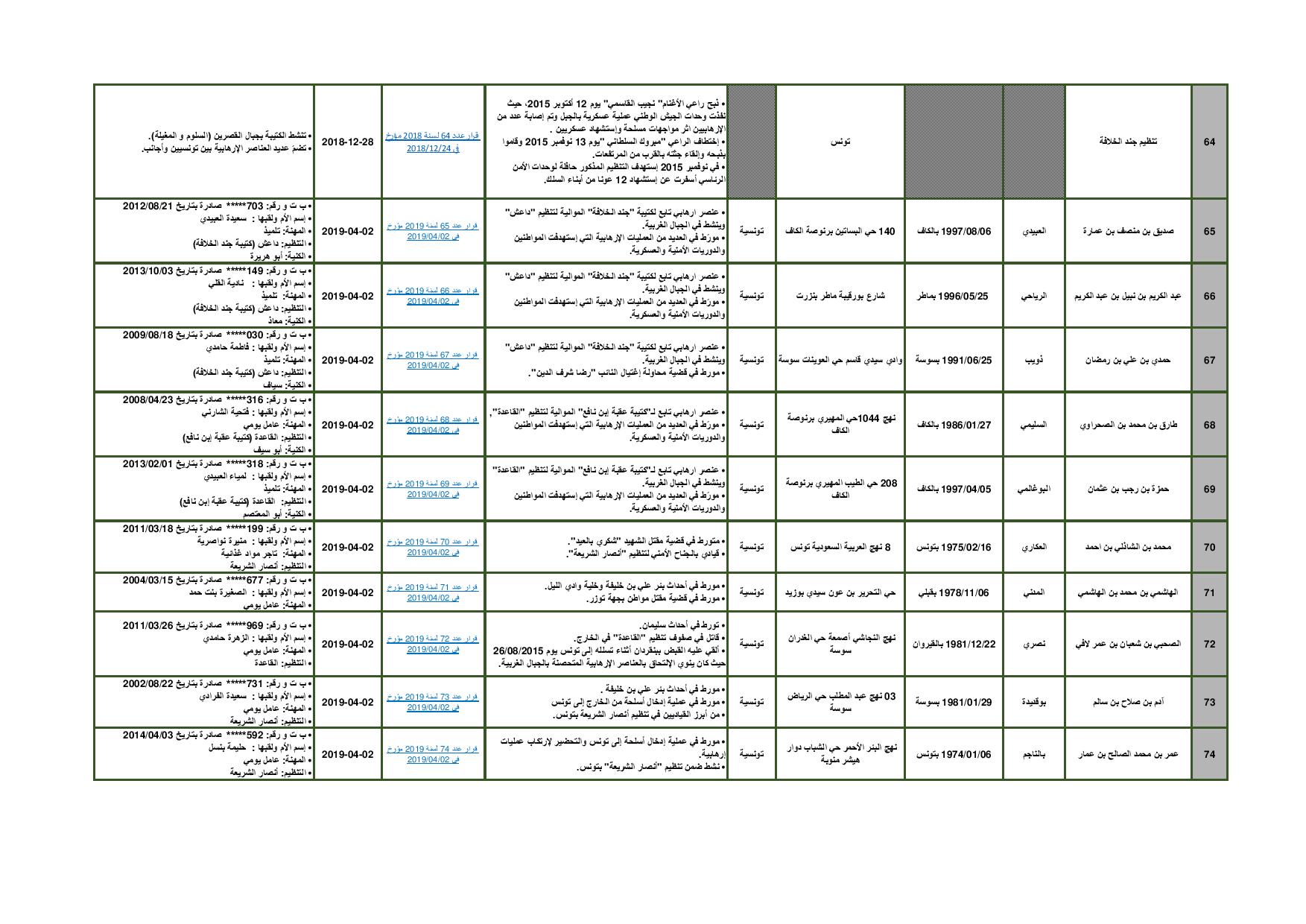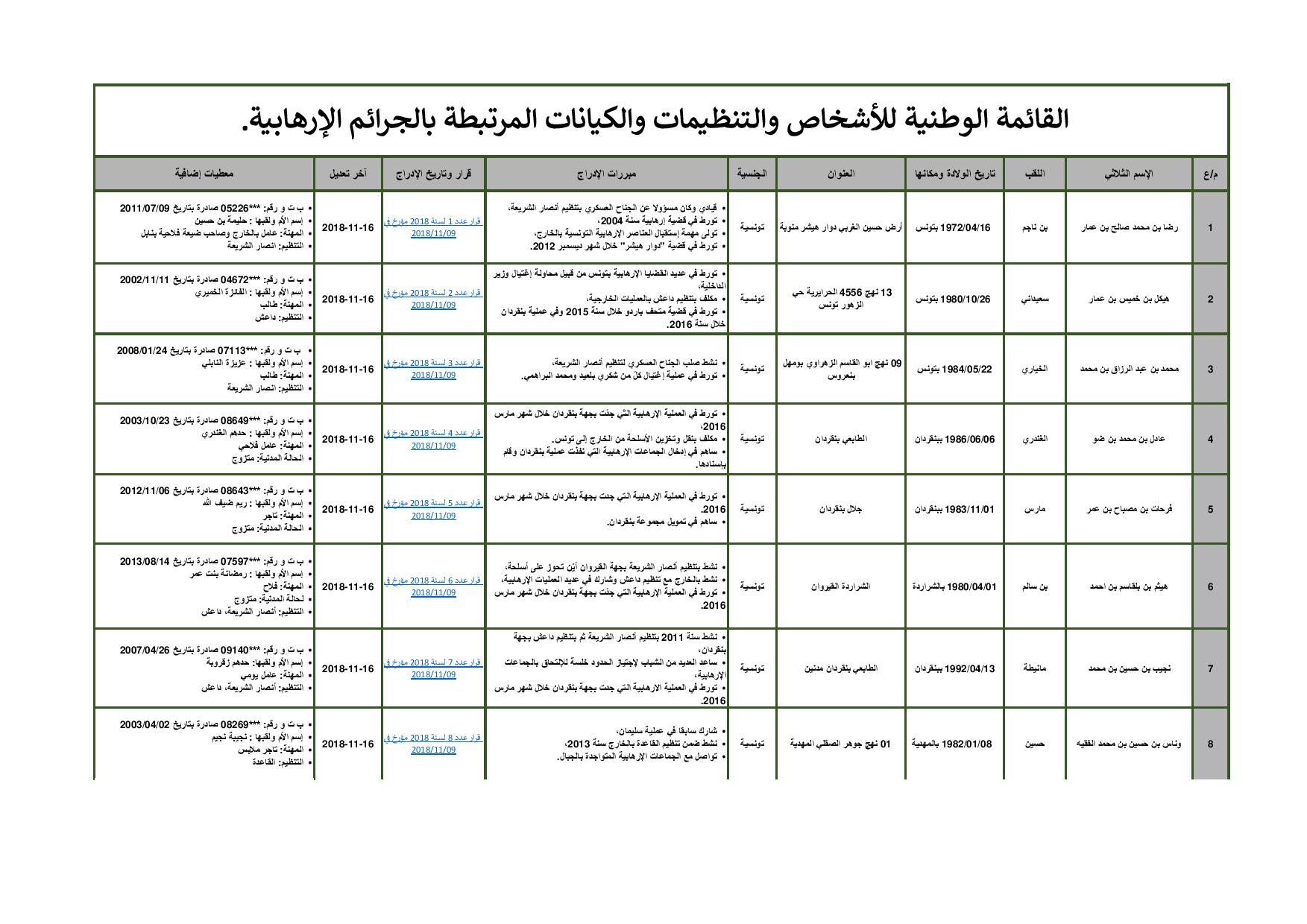 حيث أصبحت القائمة، وفق بيان صادر عن اللجنة اليوم الخميس 11 أفريل 2019، تضم 102 أشخاصا طبيعيين وتنظيما إرهابيا واحدا.