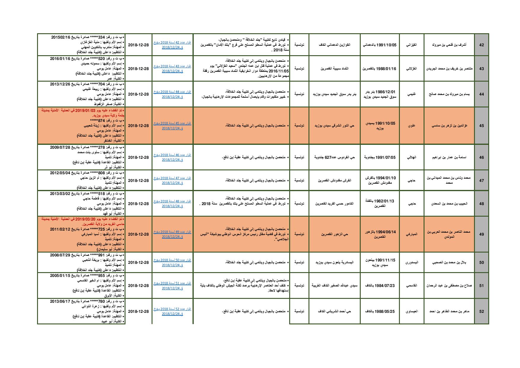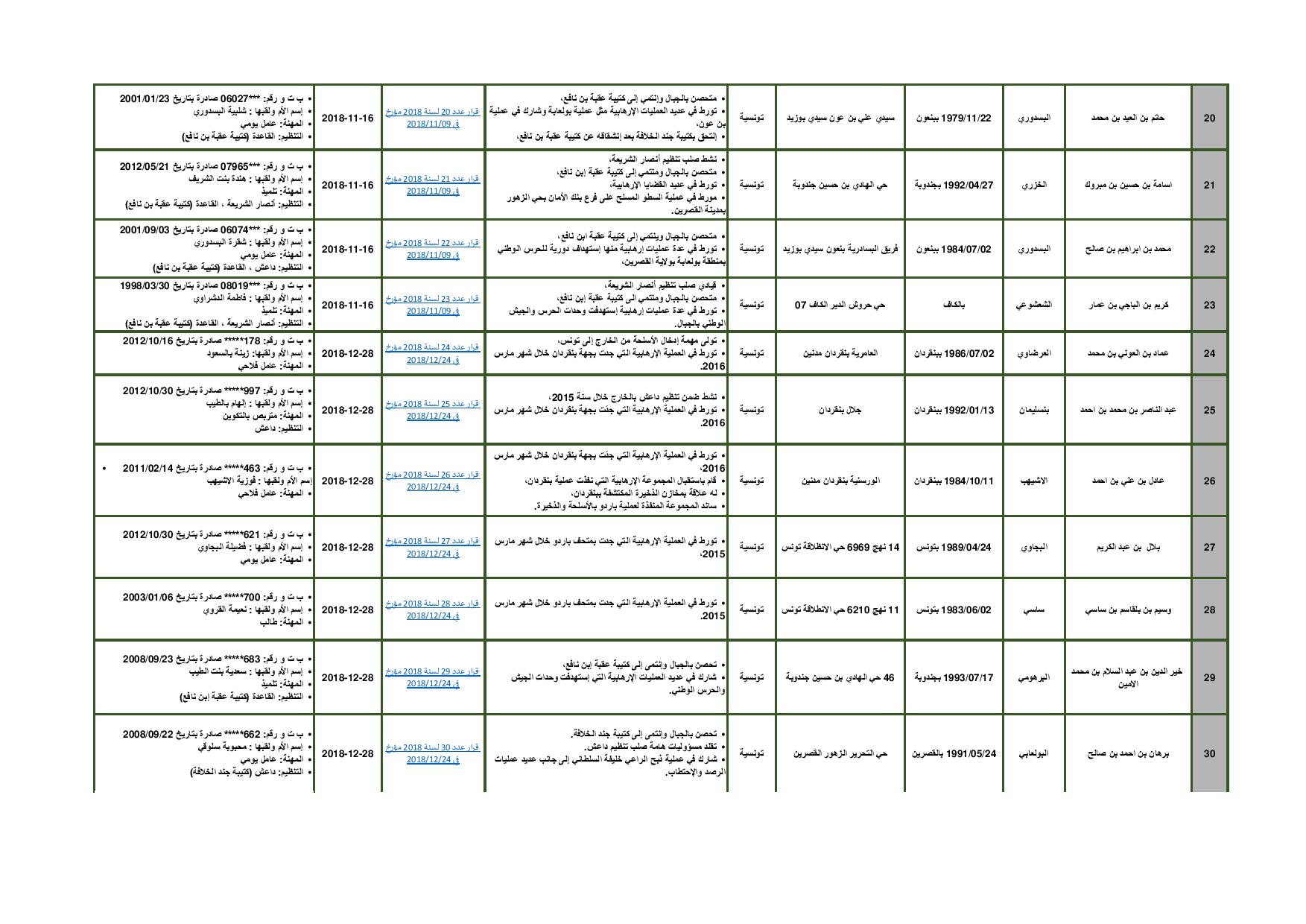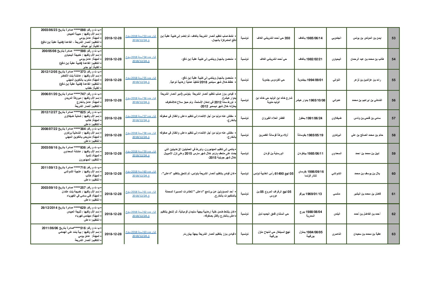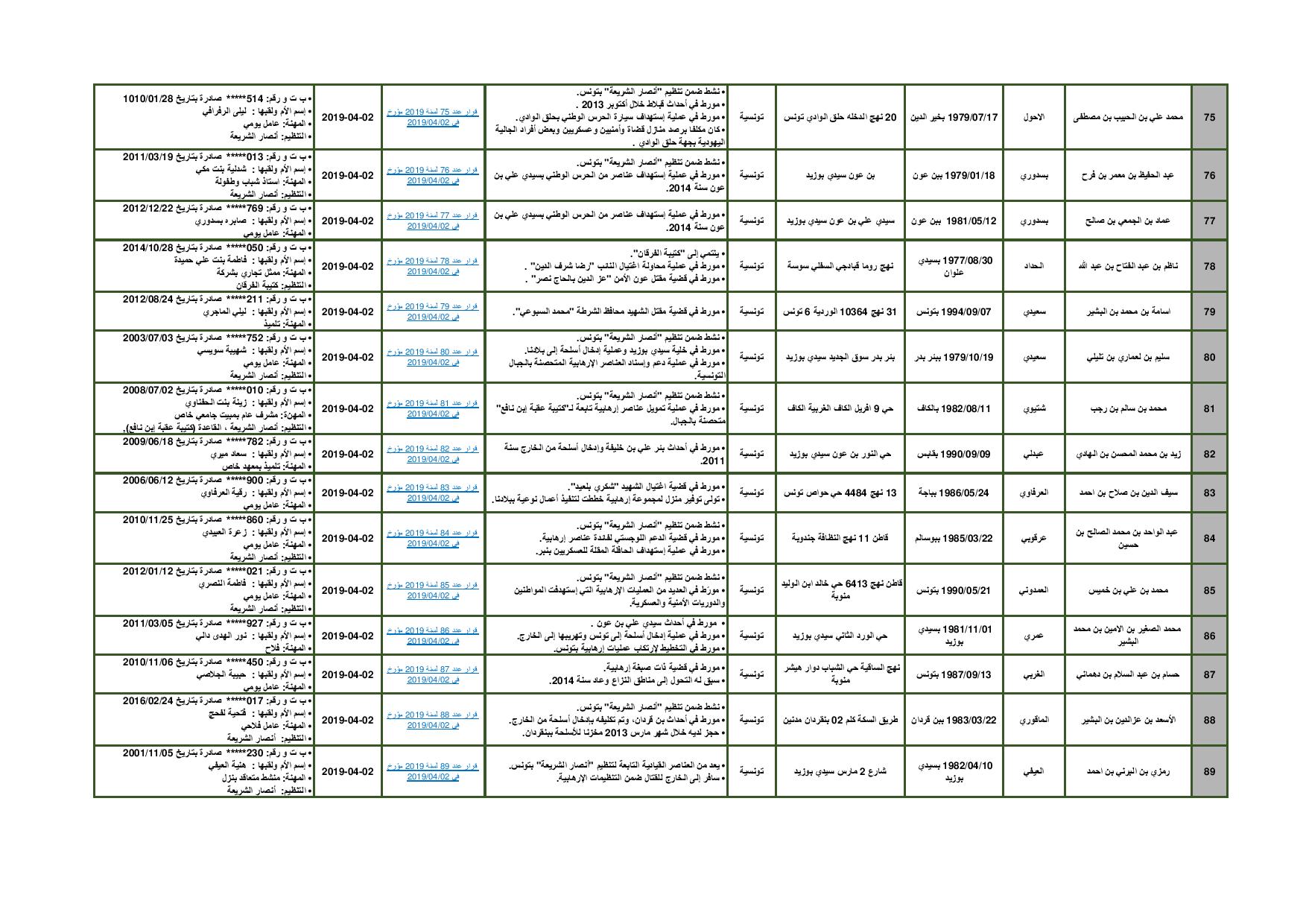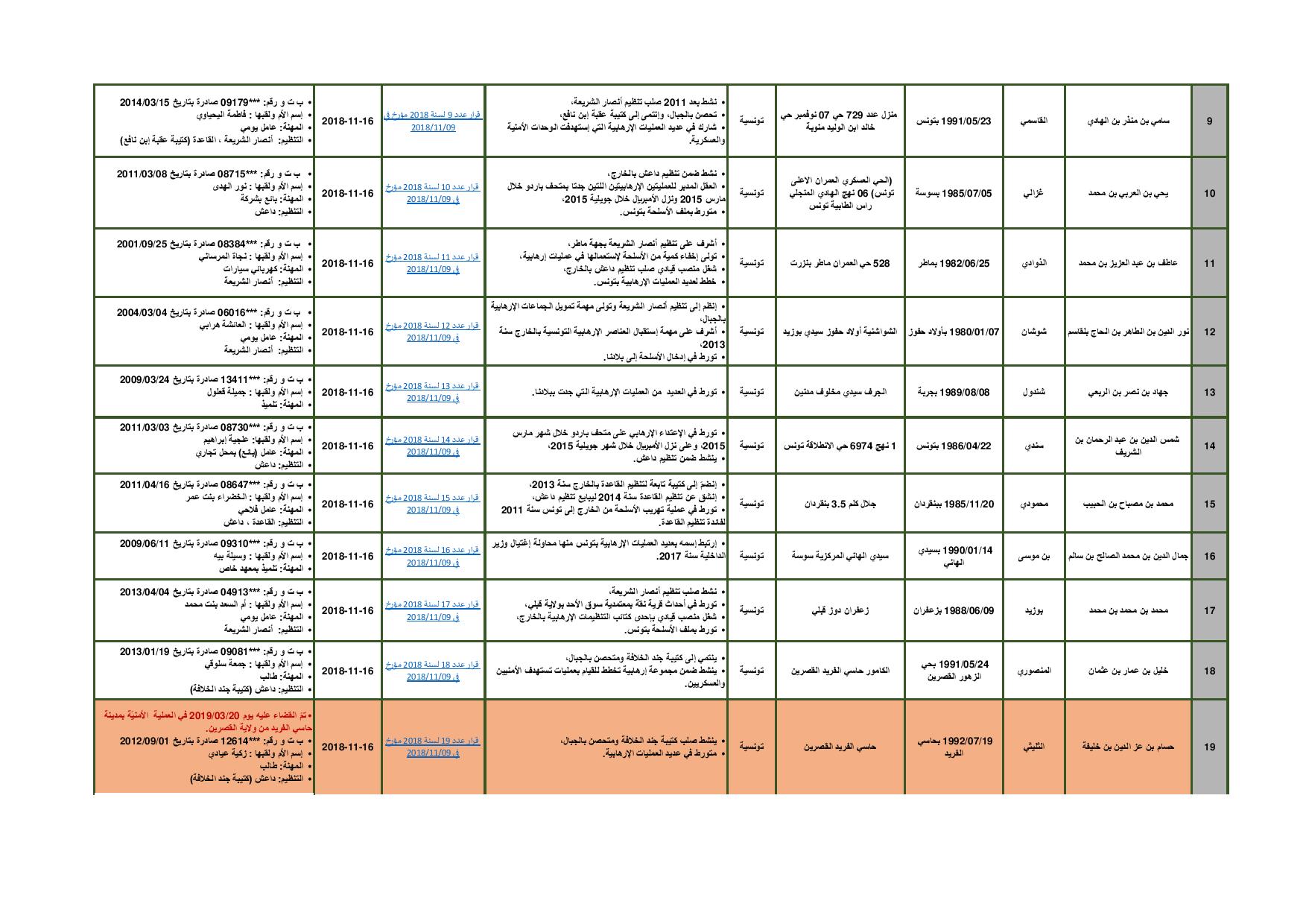 حيث أصبحت القائمة، وفق بيان صادر عن اللجنة اليوم الخميس 11 أفريل 2019، تضم 102 أشخاصا طبيعيين وتنظيما إرهابيا واحدا.