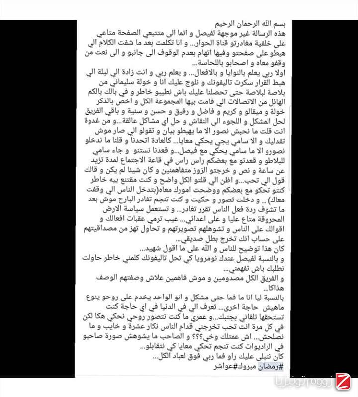 كما أفاد أنّ فيصل الحضيري يحاول في كل مرّة أن يُخرجه أمام الناس كـ" ناكر عشرة وخايب وما نصلحش" وأنّ الصديق لا يشوه صديقه في الإذاعات، مُضيفًا أنّ الحضيري أغلق هاتفه مُجدّدًا بعد إعلان انسحابه من الحوار وأنّ كل الفريق في حالة صدمة على الوصف الذي وصفهم به.