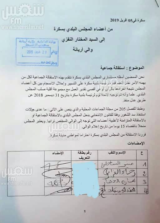 استقال، اليوم الإثنين 29 أفريل 2019، 20 مستشارًا بالمجلس البلدي بسكرة من ولاية أريانة.