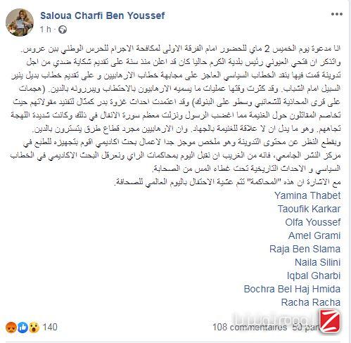ووفق ما دوّنته على حسابها الشخصي بموقع "الفايسبوك"، فإنّ ذلك يأتي بسبب تدوينة كتبتها منذ سنة وكان فتحي العيوني رئيس بلدية الكرم حاليًا قد أعلن على تقديم شكاية ضدها على خلفيتها.