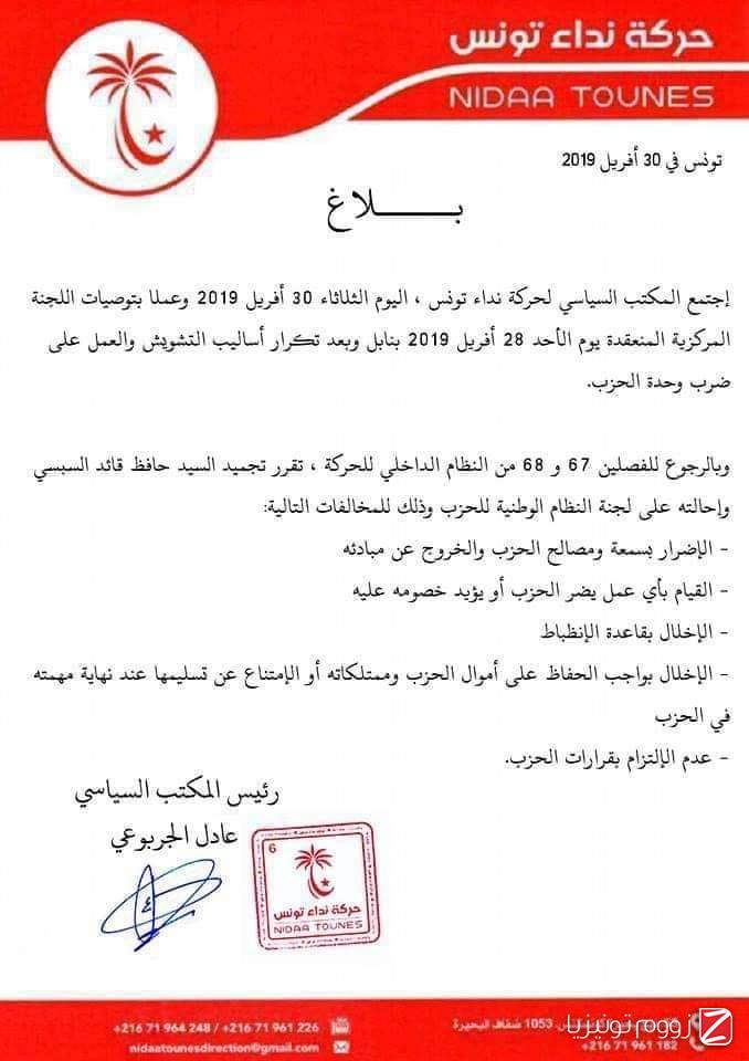 ووفق بلاغ المكتب السياسي، اليوم الثلاثاء، فإنّ ذلك يأتي بسبب ''الإضرار بسمعة ومصالح الحزب والخروج عن مبادئه والقيام بأي عمل يضر الحزب أو يؤيد خصومه عليه"، مُؤكّداً أنّ حافظ قائد السبسي أخلّ بقاعدة الإنضباط وبواجب الحفاظ على أموال الحزب وممتلكاته أو الإمتاع عن تسليمها عند نهاية مهمته في الحزب، إضافة إلى عدم الالتزام بقرارات الحزب.