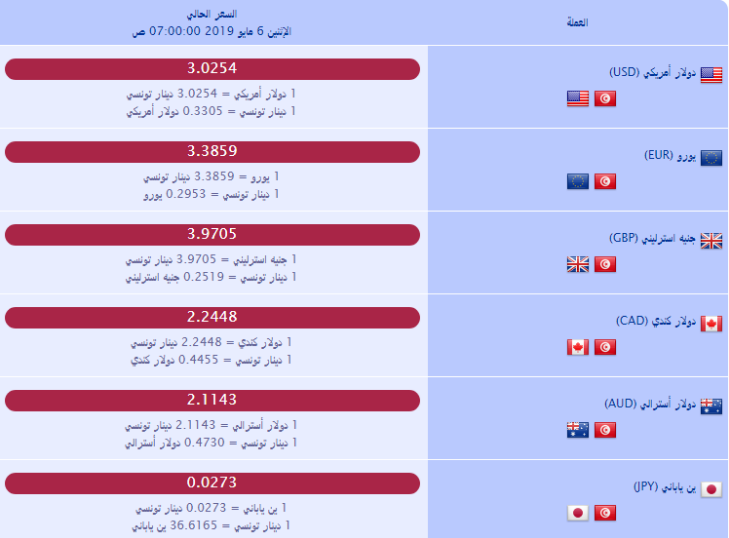أسعار العملة بالدينار التونسي لليوم الاثنين 06 ماي 2019