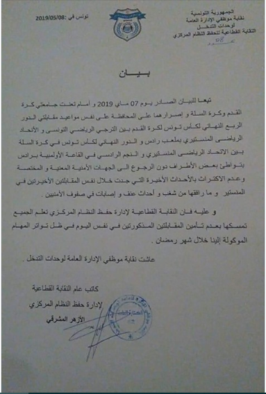 وقالت النقابة أنّ جامعتي كرة القدم وكرة السلة لم تكترث بالأحداث الأخيرة التي جدت خلال نفس المقابلتين الأخيرين في المنستير وما رفقها من شغب واحدات عنف و إصابات في صفوف الأمنيين.