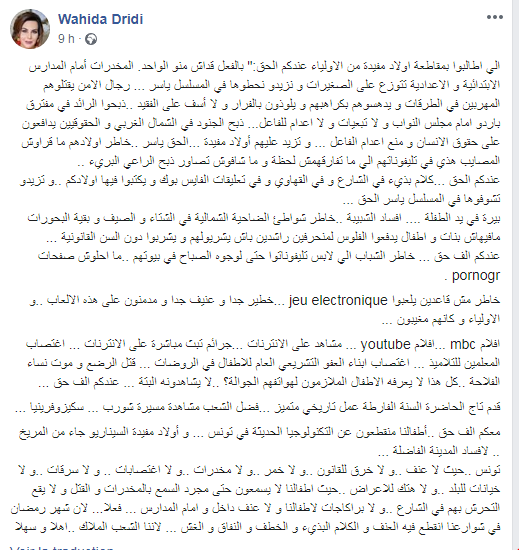 و كتبت الدريدي في نص التدوينة "الي اطالبوا بمقاطعة اولاد مفيدة من الاولياء عندكم الحق:" بالفعل قداش منو الواحد. المخدرات أمام المدارس الابتدائية و الاعدادية تتوزع على الصغيرات و نزيدو نحطوها في المسلسل ياسر ... رجال الامن يقتلوهم المهربين في الطرقات و يدهسوهم بكراهبهم و يلوذون بالفرار و لا أسف على الفقيد ..ذبحوا الرائد في مفترق باردو امام مجلس النواب و لا تبعيات و لا اعدام للفاعل... ذبح الجنود في الشمال الغربي و الحقوقيين يدافعون على حقوق الانسان و منع اعدام الفاعل ... و تزيد عليهم أولاد مفيدة ...الحق ياسر ...خاطر اولادهم ما قراوش المصايب هذي في تليفوناتهم الي ما تفارقهمش لحظة و ما شافوش تصاور ذبح الراعي البريء .."