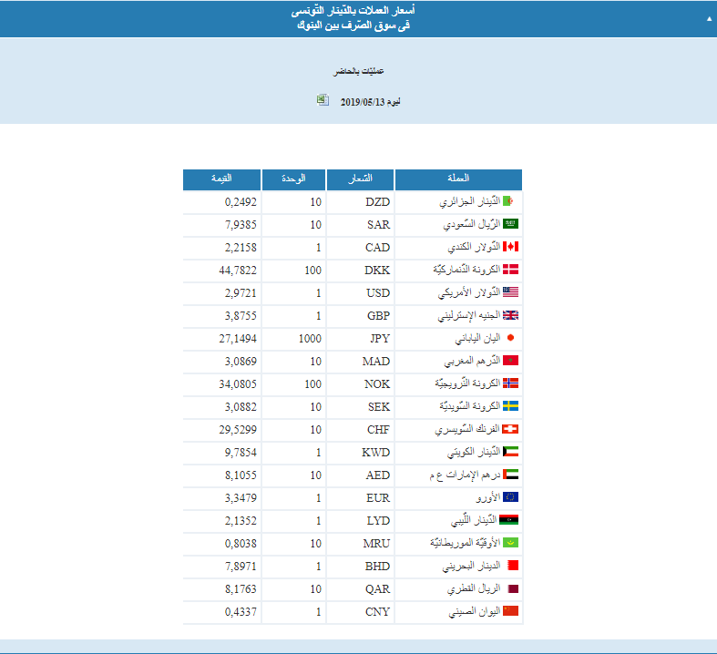 ووفق المعطيات التي نشرها فقد بلغ أن سعر الأورو الأوروبي مقابل الدينار التونسي 3.3479 دينار تونسي، وبلغ سعر الدولار الأمريكي 2.9721.