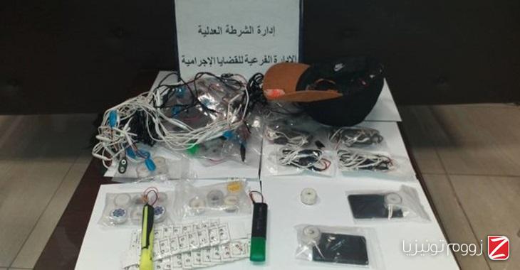 ووفق البلاغ الصادر عن وزارة الداخلية فإنه وبتفتيشه تمّ العثور لديه على 05 سمّاعات وبتعميق التحرّيات تبيّن أنه يقوم بتصنيع هذه السماعات بمفرده وإدخال تغييرات عليها، وبالتنقل إلى منزله وتفتيشه بعد مراجعة النيابة العموميّة تمّ العثور على 70 دارة إلكترونيّة صغيرة جدّا لتضخيم الصوت (Amplificateur De Son) (ثمن القطعة 200 دينار) و20 سماعة هاتف جوال تمّ إدخال تغييرات عليها (ثمن القطعة 350 دينار) و14 سماعة صغيرة الحجم وقبعة شمسيّة عاديّة مجهّزة من الدّاخل بأسلاك وسمّاعات وبطاقة إلكترونيّة (ثمن القطعة 400 دينار) و03 أقلام تحمل ثقوب لتزويدها بسماعات أو كاميرا مراقبة (ثمن القطعة 700 دينار) ولفافة من الأسلاك الكهربائيّة (Bobine) وساعة يدويّة و03 بطاقات (Cartes Bluetooth) تُستعمل لتشغيل السماعات المذكورة كما تمّ حجز مجموعة من الأقراط النسائيّة التي تُثبت بواسطة المغناطيس وجهاز حاسوب وهاتف جوّال.