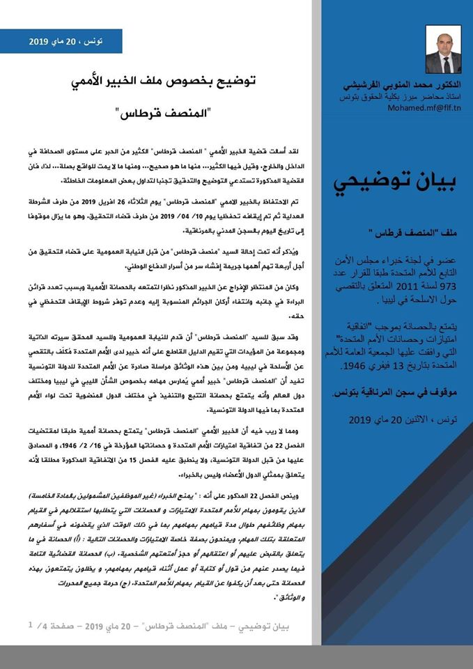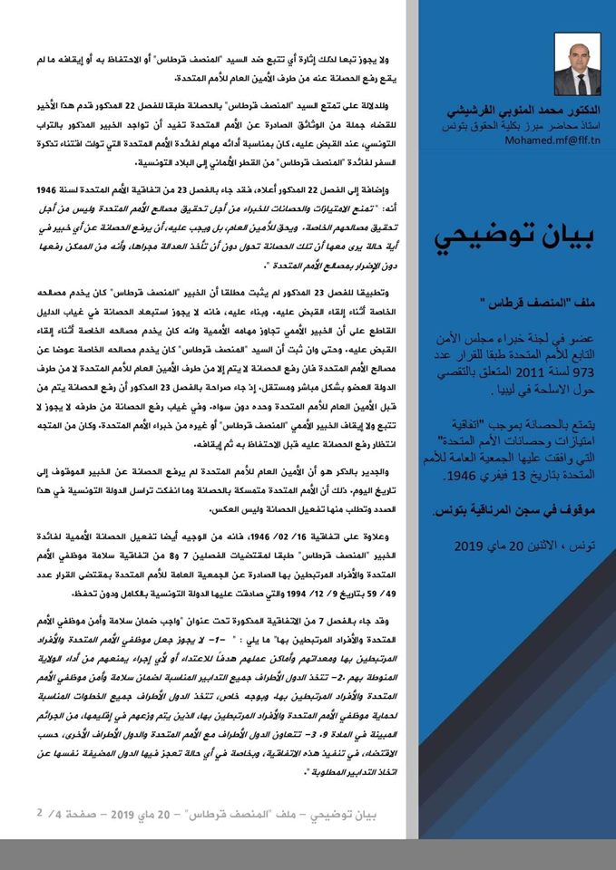 وأضاف محمد المنوبي الفرشيشي، في بيان توضيحي، أن الأمين العام لم يرفع الحصانة على الخبير الأممي "المنصف قرطاس" وبالتالي فإنّ الأمم المتحدة متمسّكة بالحصانة .