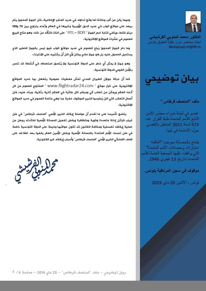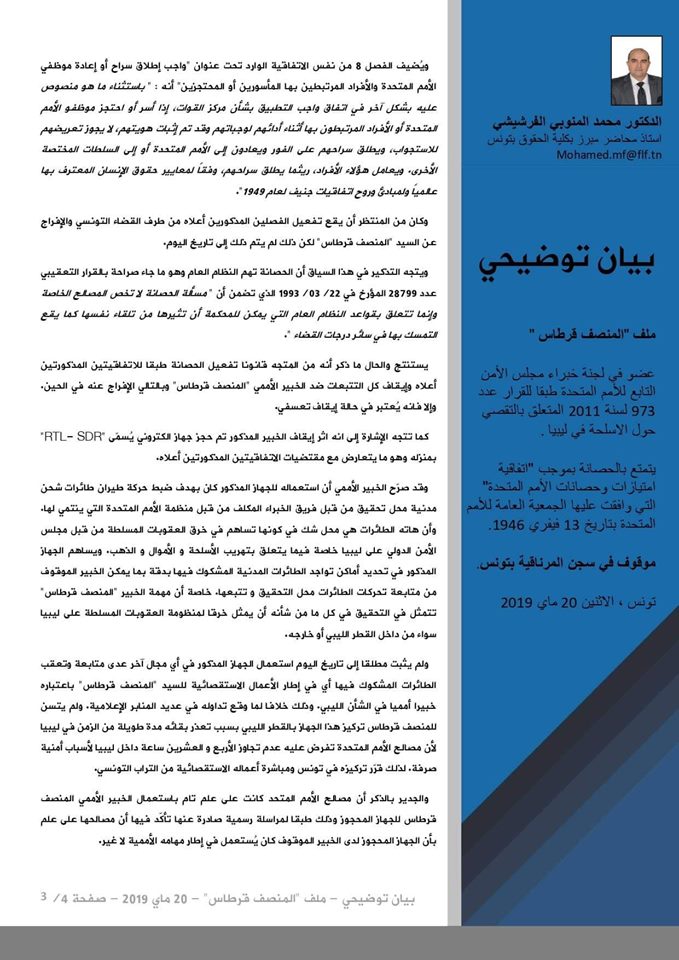 وأوضح محامي قرطاس، أن منوبه سبق وأن قدم للنيابة العمومية وللمحقق سيرته الذاتية ومجموعة من المؤيدات التي تقيم الدليل القاطع على أنه خبير لدى الأمم المتحدة مكلف بالتقصي عن الأسلحة في ليبيا ومن بين هذه الوثائق مراسلة صادرة عن الأمم المتحدة للدولة التونسية تفيد أن قرطاس خبير أممي يمارس مهامه بخصوص الشأن الليبي في ليبيا ومختلف دول العالم وأنه يتمتع بحصانة التتبع والتنفيذ في مختلف الدول المنضوية تحت لواء الأمم المتحدة بما فيها الدولة التونسية.