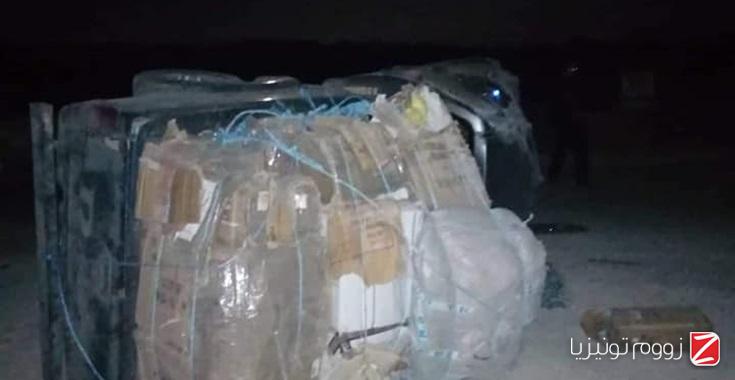 وتابعت الديوانة في بلاغ لها أنّه تم رصد رتل متكون من أربع شاحنات محملة ببضائع لا تحمل لوحات ترقيم منجمي تسير بسرعة فائقة، رفضت الامتثال لإشارات أعوان الدورية فتم سحب الحاجز المسماري وإصابة عجلات إحداها إلا أن سائقها تعمّد مواصلة السير محاولا الفرار فتمت مطاردته إلاّ أنّ الشاحنة انقلبت به بإحدى المنعرجات، وبمعاينة السيارة، تبين أن السائق غادر المكان وتحصن بالفرار.