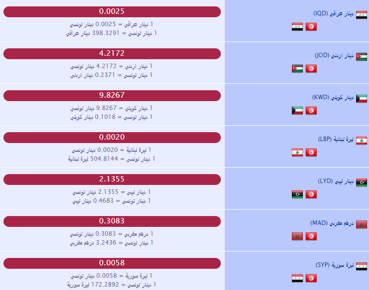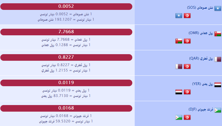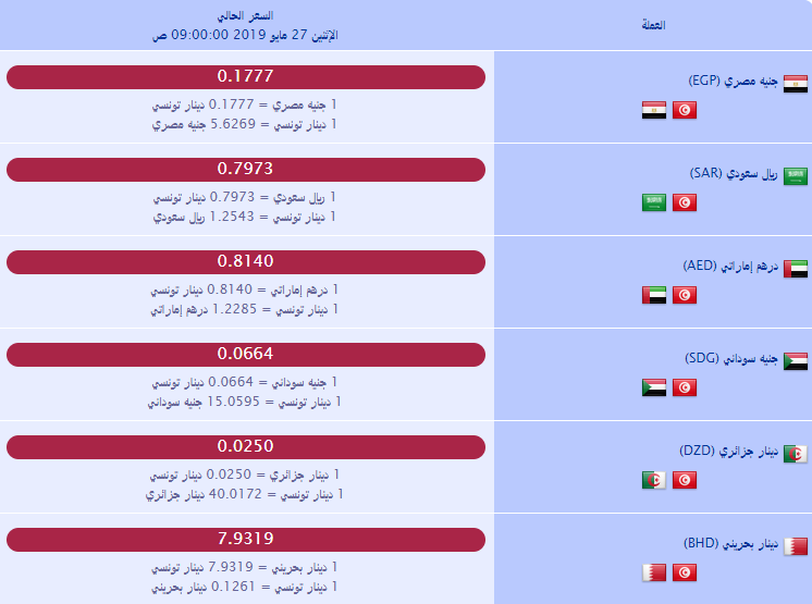 وفي ما يلي تفاصيل أسعار العملات العالمية بالدينار التونسي لهذا اليوم الإثنين، 27 ماي 2019 :