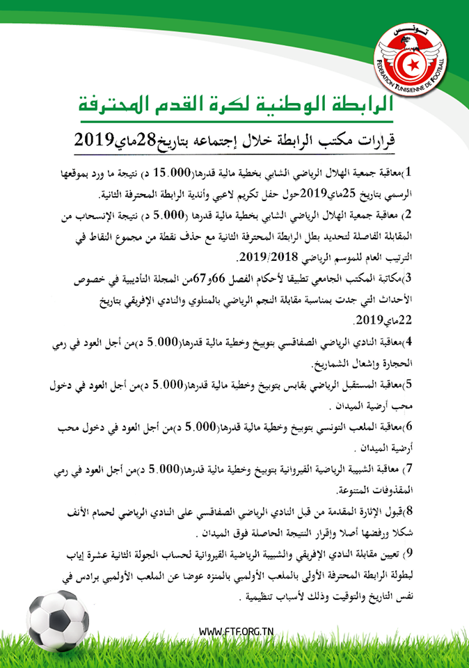 زووم - أعلنت الجامعة التونسية لكرة القدم اليوم الثلاثاء 12 جانفي 2020، عن قرارات لجنة الطوارئ إثر مطالبة مسؤولي النادي ا ...