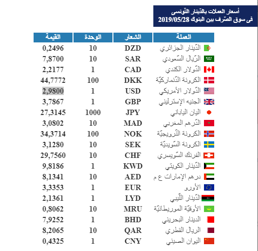 وكان البنك المركزي قد نشر تحيينًا لأسعار العملات بالدينار التونسي في سوق الصرف بين البنوك (28 ماي 2019).
