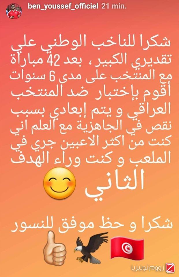 وقال بن يوسف ، عبر حسابه الشخصي على "الانستغرام"، أنّه قد تمّ اِبعاده بعد 42 مباراة مع المنتخب علـى مدى 6 سنوات.
