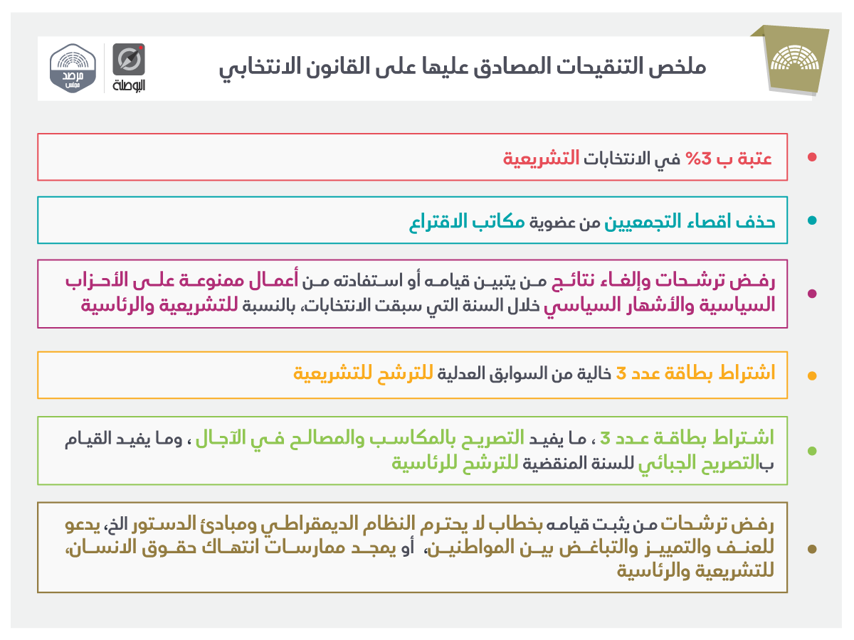 وفيما يلي ملخص للتنقيحات المصادق عليها ضمن القانون الانتخابي بحسب ما نشرته منظمة بوصلة على صفحتها الرسمية :