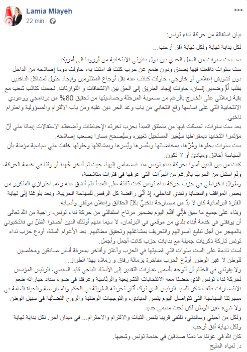 وكتبت لمياء مليح في نص التدوينة "أقدّم اليوم بضمير مرتاح استقالتي من حركة نداء تونس، راجية من الله تعالى أن يوفقني في خدمة أبناء بلدي من موقعي في البرلمان، لا سيما منهم أولئك الذين أحسنوا الظنّ بي فانتخبوني بالمهجر من أجل تبليغ أصواتهم والتعريف بمشاغلهم وتحقيق مطالبهم، بعد الأعوام الستة، أودع حزب نداء تونس تاركة ذكريات جميلة مع بدايات حزب كانت أجمل وأجمل".