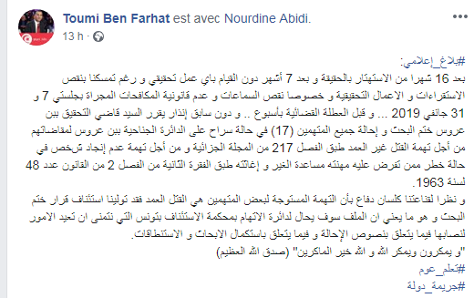 وتابع محامي العائلة في تدوينة على حسابه الرسمي أنه تم استئناف قرار ختم البحث، حيث ستتم إحالة الملف على دائرة الاتهام بمحكمة الاستئناف بتونس.