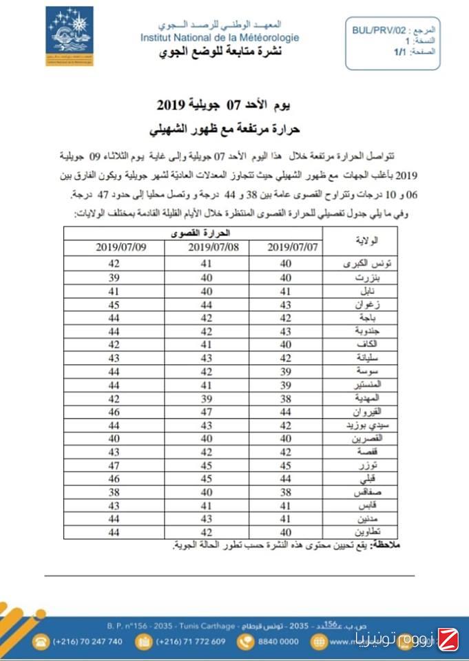 وأضاف المعهد أنّ هذه الحرارة تتجاوز المعدّلات العادية لشهر جويلية ويكن الفارق بين 06 و10 درجات، فيما تترواح القصوى عامّة بين 38 و44 درجة وتصل محليّا إلـى حدود 47 درجة.
