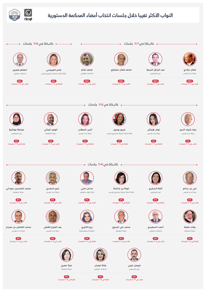 ووفق ما نشرته "البوصلة" فإنّ هنالك أسماء سجلّت غيابها بشكل مُتكرّر في جلسات الانتخاب أغلبها من كتلة حركة نداء تونس (8 نوّاب من أصل 27 نائب) فيما توّزعت البقية بين نوّاب كتلة حركة النهضة، الكتلة الديمقراطية، كتلة الحرّة لمشروع تونس، الائتلاف الوطني، وغير المنتمين أيضًا.