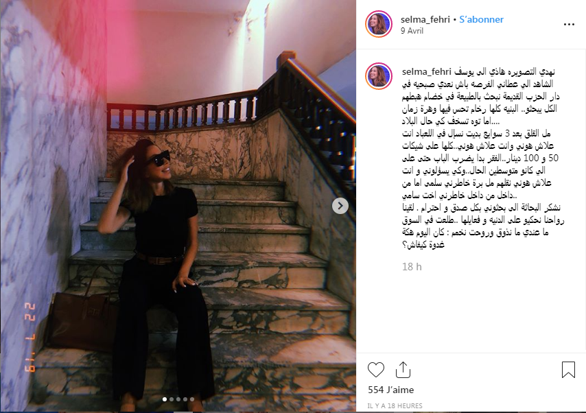 ونشرت سلمى الفهري عبر حسابها الرسمي "انستغرام" صورة لها بمقرّ الادارة الفرعية للأبحاث الاقتصادية والمالية قالت أنها تُهديها لرئيس الحكومة يوسف الشاهد.