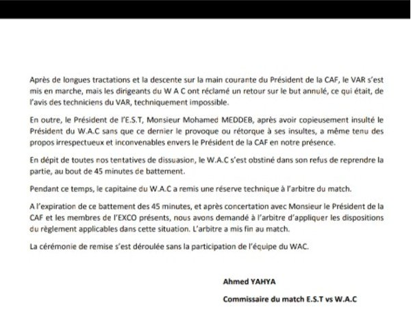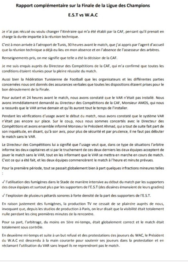 ولم يكن التقرير الذي قدّمه مراقب المباراة الموريتاني لصالح الترجي الرياضي التونسين، حيث ورد بالتقرير المذكور رمي مقذوفات من جماهير الترجي وعدم جاهزية "الفار" قبل 24ساعة من المباراة، بالإضافة إلى تجاوزات ارتكبها رئيس الترجي حمدي المدب.