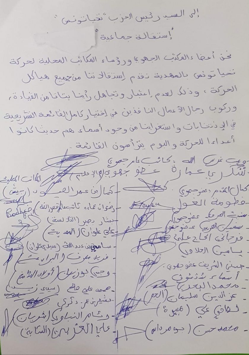 وجاءت هذه الاستقالة على خلفية تجاهل القيادة لأرائهم وركوب رجال أعمال في اختيار كامل القائمة التشريعية في الانتخابات، حسب نص الاستقالة.