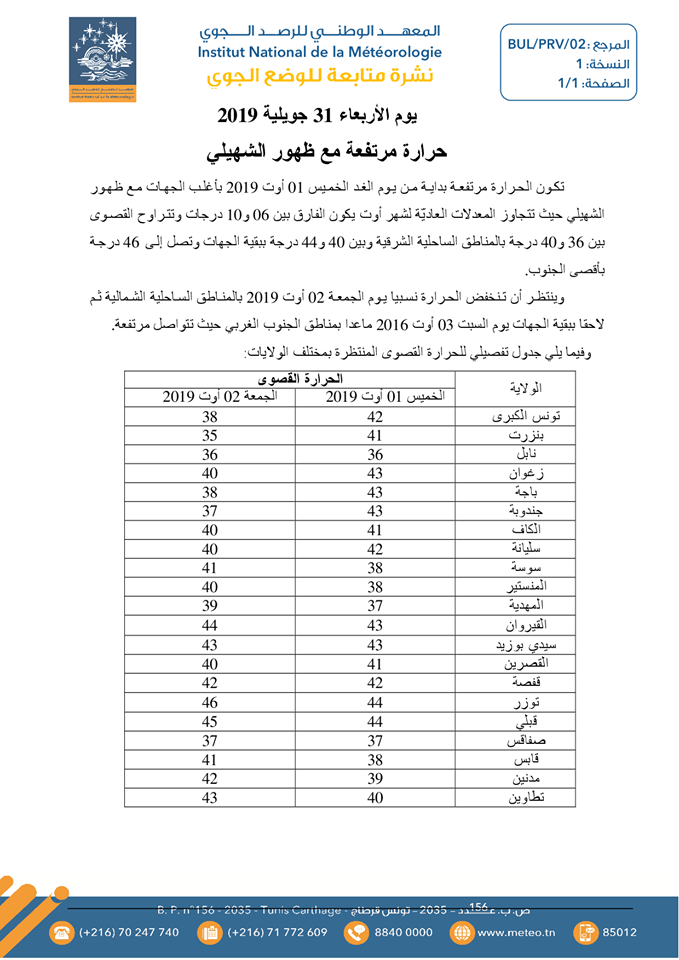 كما أكّد الرصد أنّ الحرارة ستكون مرتفعة بدايةً من الغد بأغلب الجهات، حيث تكون الحرارة القصوى المُنتظرة بمختلف الولايات كالتالي :