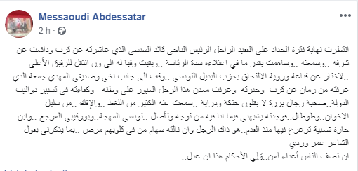 من جهته نشر المسعودي تدوينة على حسابه على فايسبوك أعلن فيها عن انضمامه لحزب البديل قائلا أنه "سيقف إلى جانب المهدي جمعة لكفاءته في تسيير دواليب الدولة".