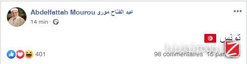 أمّا عبد الفتاح مورو الذي دخل الليلة رسميًا سباق الانتخابات الرئاسية عن حركة النهضة فقد خيّر في أوّل تعليق له الاِكتفاء بتدوين عبارة "تونس" مع رمز للعلم التونسي وذلك عبر صفحته الرسمية على موقع التواصل الاجتماعي "فايسبوك".