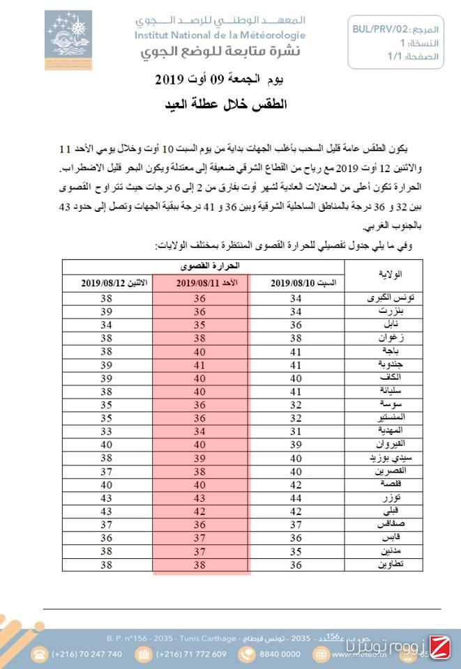 - تتراوح الحرارة القصوى بين 32 و 36 درجة بالمناطق الساحلية الشرقية و بين 37 و 42 درجة ببقية الجهات مع ظهور الشهيلي محليا.