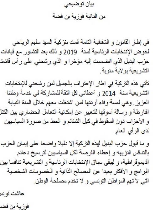 واعتبرت النائبة في بيان توضيحي نشرته على حسابها على فايسبوك، أنّ تزكيتها لسليم الرياحي في الانتخابات الرئاسية، تمت في إطار القانون والشفافية التامة، وبعد التشاور مع قيادات حزب البديل الذي ترشحت على رأس قائماته للانتخابات التشريعية بولاية منوبة.