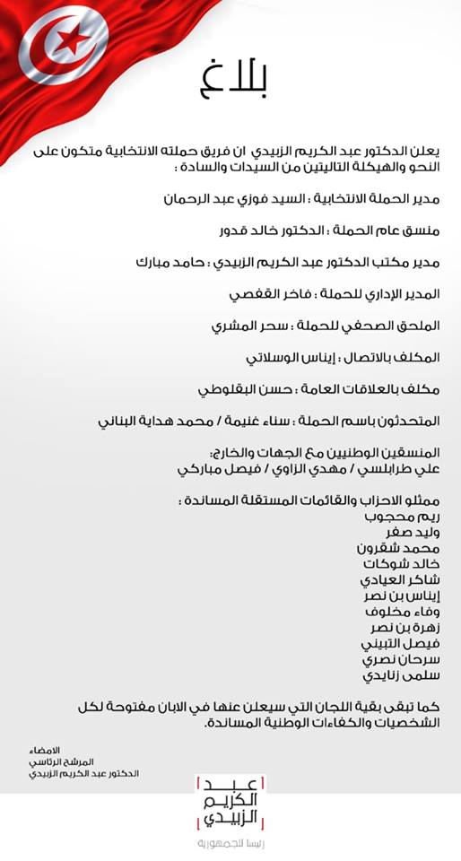 ووفق ما ورد في بلاغ نُشر على الصفحة الرسمية للزبيدي يضم فريق حملته الانتخابية الأسماء التالية: