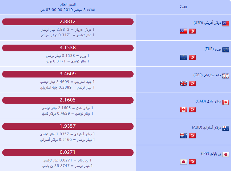 أسعار العملة بالدينار التونسي لليوم الثلاثاء 03 سبتمبر 2019