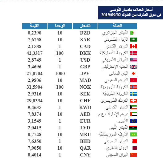 أسعار صرف العملة بالدينار التونسي اليوم الخميس 14 نوفمبر 2019