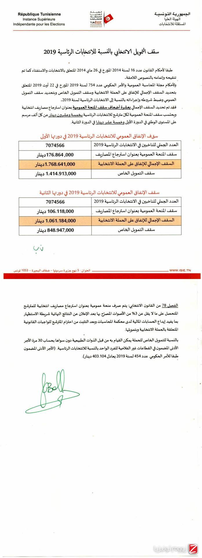 ويُقدّر السقف الاجمالي للانفاق على الحملة الانتخابية الرئاسية في دورتها الأوّل بـ 1.768.641،000 دينار مُقابل 1.061.184،000 في دورتها الثانيّة.