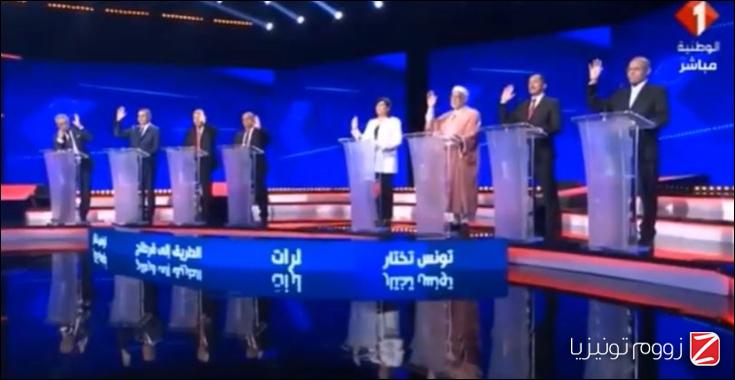 واليوم حضر المناظرة التلفزية تحت شعار "الطريق إلى قرطاح ..تونس تختار" كل من عبد الفتاح مورو، المنصف المرزوقي، محمّد عبو، عبير موسي، عمر منصور، المهدي جمعة، عبيد البريكي وناجي جلول، فيما تغيّب المترشّح نبيل القروي بإعتباره رهن الإيقاف.