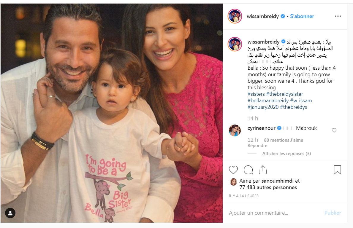 وكشف كل من وسام بريدي وريم السعيدي أن موعد الولادة بعد أربعة أشهر وكتبا متحدثين باسم بيلا: "سعيدة جداً بأنه قريباً جداً، أقل من أربعة أشهر، ستصبح عائلتنا أكبر، سنصبح أربعة، الشكر لله على نعمه."