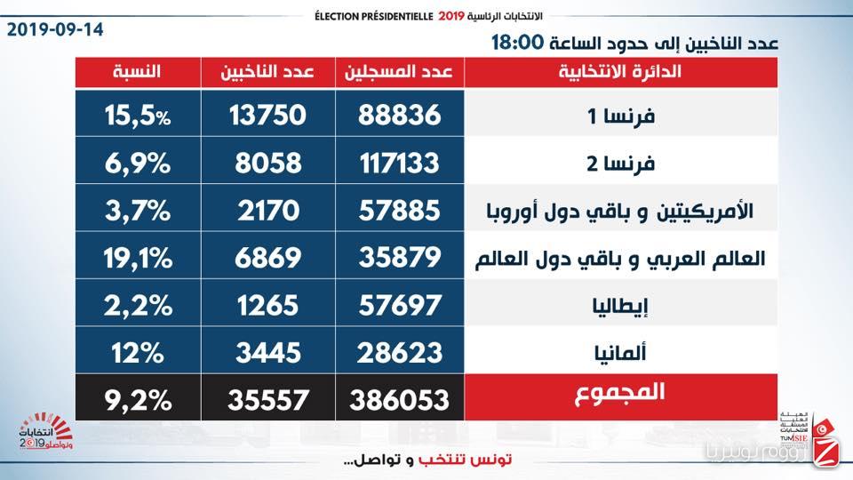 ووفق ما أعلنته الهيئة خلال ندوة صحفية منذ قليل، فإنّ نسب الاقبال إلى غاية اليوم السبت 14 سبتمبر إلى حدود الساعة 18 كانت كالتالي: