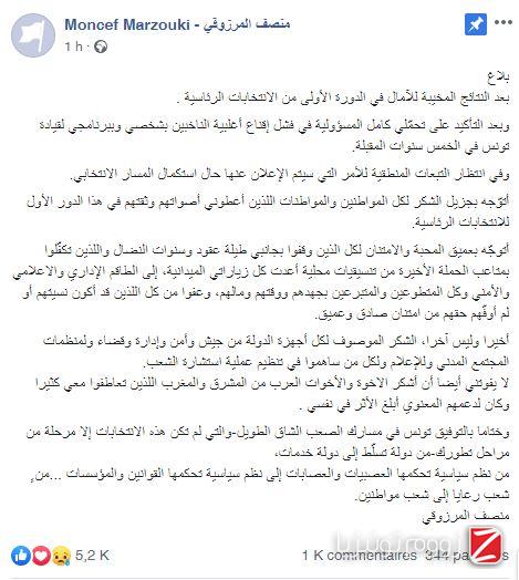 وشدّد المرزوقي ، في بيان له، على تحمّله "كامل المسؤولية في فشل إقناع أغلبية الناخبين بشخصي وببرنامجي لقيادة تونس في الخمس سنوات المقبلة".