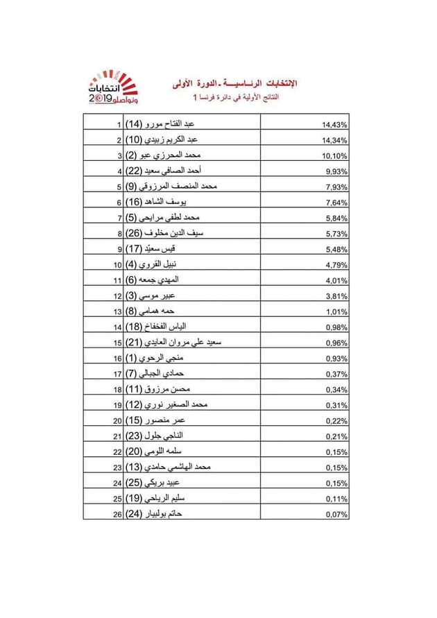 ووفق ما نشرته الهيئة فقد احتلّ المترشح عن حركة النهضة عبد الفتاح مورو في المرتبة الأولى بنسبة 14.43 بالمائة، يليه المترشح عبد الكريم الزبيدي بنسبة 14.34 بالمائة، ثم كل من محمد عبو في المرتبة الثالثة بنسبة 10.10 بالمائة، والصافي سعيد في المرتبة الرابعة بنسبة 9.93 بالمائة، والمنصف المرزوقي في المرتبة الخامسة بنسبة 7.93 بالمائة.