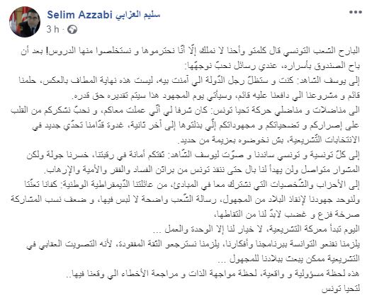 وتابع العزابي قائلا "خسرنا جولة ولكن المشوار متواصل"...في إشارة إلى الانتخابات التشريعية القادمة والتي ترشح بها حزب تحيا تونس بـ33 دائرة انتخابية.