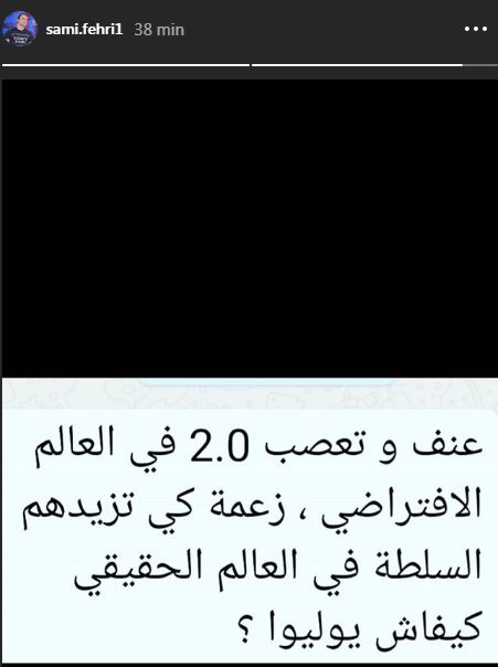 ودوّن الفهري على صفحته الرسمية على "انستغرام" "عنف وتعصب 0.2 في العالم الافتراضي، زعمة كي تزيدهم السلطة في العالم الحقيقي كيفاش يوليوا".